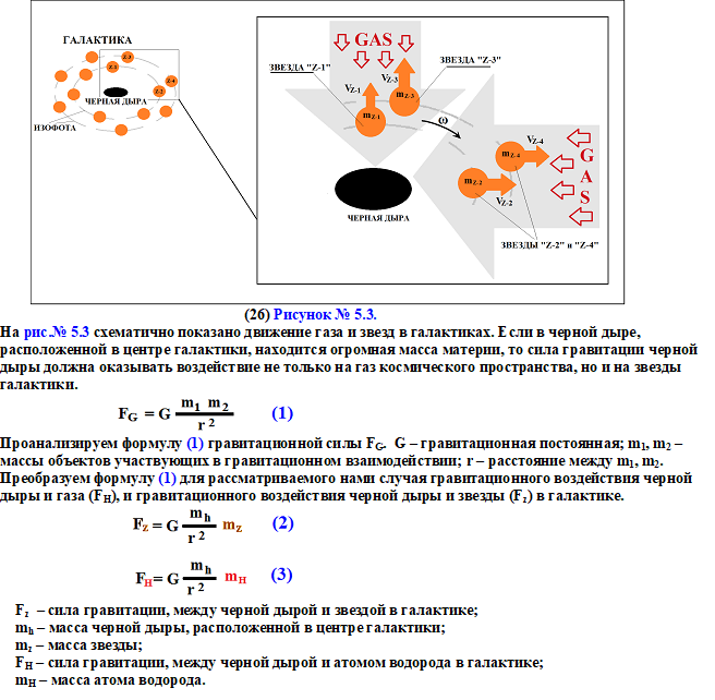 Реально, в галактиках, звезды с большими массами и с большой гравитацией удаляются от черной дыры и от центра галактики, а атомы водорода с силой гравитации в 1057 раз меньше, движутся к центру галактики, к черной дыре рис. № 5.4.