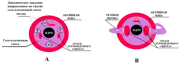 (рисунок № 2.3-A). Под действием этого динамического давления образуются очаги термоядерного синтеза в виде высокоэнергетической плазмы. Эти очаги термоядерного синтеза поднимаются в верхние слои звезды, пополняя активную зону высокоэнергетической плазмой. Пополнение активной зоны высокоэнергетической плазмой необходимо, т.к. происходит ее излучение с поверхности звезды в космос. Это излучение высокоэнергетической плазмы создает корону, переходящую в звездный ветер и гелиосферу звезды. Горячая газо-плазменная смесь стремиться расширится, но гравитация и динамические процессы, происходящие в активной зоне, удерживают газо-плазменную смесь в объеме звезды. В этом случае активная зона является плазменной оболочкой звезды. Плазменная оболочка звезды является не жесткой. Это свойство не жесткости оболочки, предохраняет звезду от разрушения, при мощных термоядерных взрывах внутри звезды рис. № 2.3-B. Рассмотрев конструкцию звезды, мы видим сходство с конструкциями теплового котла и ядерного реактора. В случае возникновения критических параметров в тепловом котле, происходит сброс давления, через предохранительные клапана. Предохранительные клапана, предохраняют тепловой котел от разрушения. В урановых реакторах, из-за опасности попадания радиоактивного вещества в окружающую среду, таких предохранительных клапанов нет. В случае аварийного выделении энергии, в урановых реакторах, происходит тепловой взрыв и разрушение реактора. В конструкции звезды существует защита от разрушения, при выделении в звезде критической энергии. Оболочка звезды состоит из высокоэнергетической плазмы и является не жесткой. При критическом выделении энергии, внутри звезды, критическое давление газо-плазменной смеси прорывает плазменную оболочку, образуя «темные пятна» на поверхности звезды. Через темные пятна происходит сброс критической энергии в космическое пространство. Темные пятна на поверхности звезды являются «предохранительными клапанами» для звезды. То есть, активная зона звезды является: