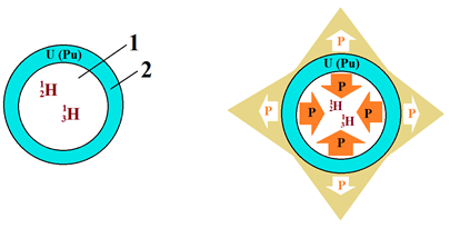 Напомним ее устройство и принцип действия. В центре бомбы находится объем с водородным топливом, который со всех сторон окружает заряд урановой бомбы. Взрыв урановой бомбы сжимает заряд водородной бомбы и запускает процесс термоядерного синтеза. Происходит взрыв водородной бомбы рис. № 2.1.