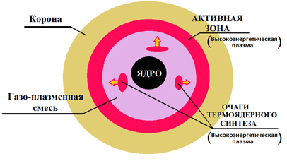 Очаги термоядерного синтеза, рожденные внутри звезды, в ее газо-плазменной смеси, поднимаются в верхние слои атмосферы рис. № 2.2. Очаги термоядерного синтеза являются высокоэнергетической плазмой, удельная масса, которой меньше удельной массы водорода и гелия в газо-плазменной смеси звезды. Поднявшись в верхние слои звезды, высокоэнергетическая плазма равномерно распределится и образует плазменную оболочку звезды. Назовем эту область «активной зоной», так как, в ней идет термоядерный синтез.