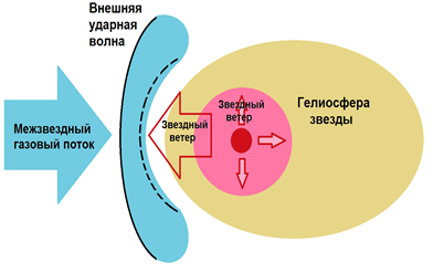 Если на уровне орбиты Земли плотность звездного ветра равняется 15 частицам на сантиметр кубический, то у поверхности Солнца плотность звездного ветра более 210 000 частиц на сантиметр кубический. Удаляясь от поверхности звезды, пройдя корону, излучения и звездный ветер, формируют (образуют) гелиосферу звезды. Гелиосфера звезды защищает звезду от воздействия потоков газа и пыли в космическом пространстве Рис. № 2.4. Звездный ветер и гелиосфера звезды образуют энергетический пузырь, предохраняющий звезду от внешнего воздействия. Излучение энергии с поверхности звезды создает внутри гелиосферы пониженную концентрацию материи. Это излучение энергии вытесняет материю из объема гелиосферы и препятствует проникновению материи из космического пространства. Такое конструктивное сочетание звезды, короны, звездного ветра и гелиосферы, исключает разрушение звезды от воздействия внешней среды, и устраняет сопротивление движению звезды, в любом направлении. Гелиосфера звезды деформируется под воздействием внешней среды. Параметры этой деформации зависят от параметров движения самой звезды и параметров движения потоков газа воздействующих на гелиосферу. Для разрушения звезды под воздействием внешних факторов, необходимо критически деформировать гелиосферу, звездный ветер и корону звезды. Молодые звезды имеют крепкую гелиосферу, способную противостоять газовым потокам в центре галактики в районе галактических черных дыр, сохраняя параметры своего движения.