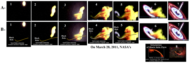 То есть, конструкция черной дыры, которую, мы видим, на фотографиях 6 и 7, уже существовала до поглощения звезды черной дырой. Поглощение черной дырой светящегося газа (плазмы), раскрыло (освятило) ее конструкцию и раскрыло траекторию (путь) движения газа, поглощаемого черной дырой.