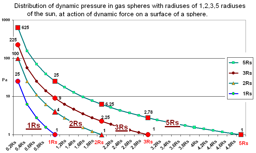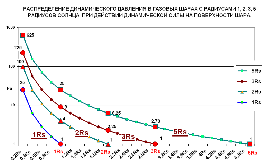 Из данного графика видно, что с увеличением радиуса звезды динамическое давление в ее недрах увеличивается в квадратной зависимости. Так, у звезды с радиусом два радиуса Солнца на уровне радиуса Солнца давление выше солнечного в четыре раза. При радиусе звезды в три солнечных радиуса давление возрастает до девяти солнечных. При радиусе звезды в пять солнечных радиусов давление возрастает в двадцать пять раз. На уровне 0,2 солнечных радиуса, где давление в звезде с радиусом Солнца увеличивается в 25 раз, давление в звезде с радиусом в два раза больше солнечного — давление увеличивается в 100 раз. В звезде с тремя радиусами Солнца — в 225 раз больше, а в звезде с пятью радиусами Солнца — в 625 раз больше. То есть, с увеличением радиуса звезды увеличивается сила сжатия ее недр, что увеличивает скорость синтеза ядер и увеличивает вероятность синтеза тяжелых ядер.