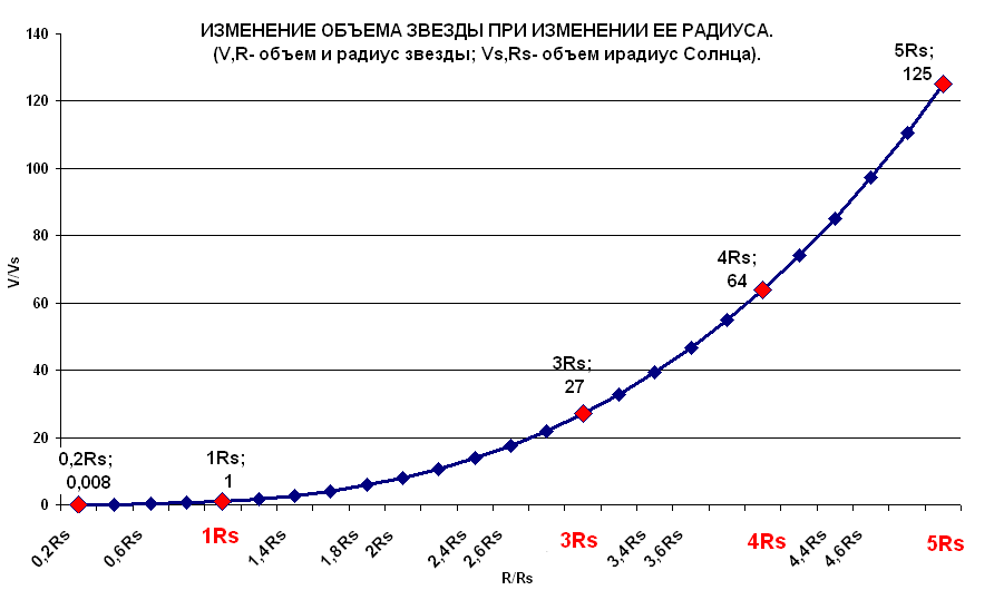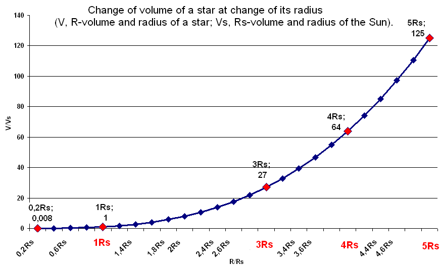 Увеличение размеров звезды влияет на скорость синтеза не только за счет увеличения давления в звезде, но и за счет увеличения объема самой звезды. Увеличение объема звезды, позволяет увеличивать количество ядер, участвующих в синтезе. Данное увеличение уже имеет кубическую зависимость, как показано на графике № G-4.2. Так, увеличение радиуса звезды в 3 раза, увеличивает объем звезды в 27 раз, при увеличении радиуса звезды в 4 раза, объем увеличивается в 64 раза, при увеличении в 5 раз, объем увеличивается в 125 раз.