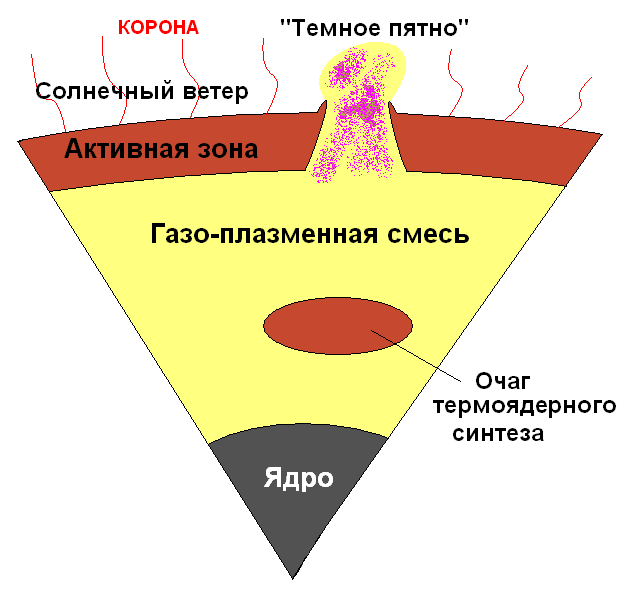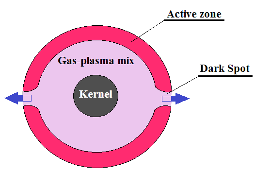 газо-плазменной смеси. В случае повышения параметров газо-плазменной смеси при повышенном выделении энергии в звезде происходит прорыв активной зоны, и часть газо-плазменной смеси выбрасывается в космическое пространство через темные пятна звезды.