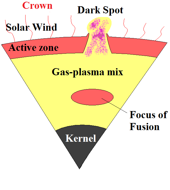 В активной зоне, термоядерный синтез поддерживается подачей ядерного топлива (водорода и гелия) из газо-плазменной смеси. Так как, водород и гелий являются самыми легкими газами, то они находятся в самых верхних слоях газо-плазменной смеси, т.е. самое энергетически емкое топливо подается в активную зону. Термоядерный синтез в верхних слоях звезды (в активной зоне) создает динамическое давление, направленное вовнутрь звезды, на сжатие газо-плазменной смеси
