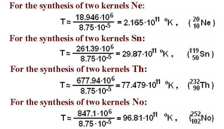 The values of these temperatures are simply fantastic. We shall not assort the variants with tunnel effect; the parameters will be high in this case as well. It is visible from the calculations, that inside of the stars, a synthesis of heavy kernels is impossible, as, temperature in stars is low. This is the conclusion that was made by physics theorists.