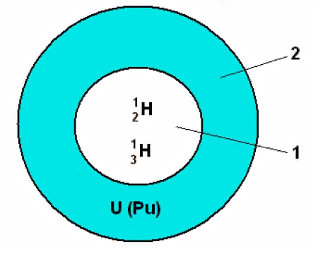 As a result of the explosion of a uranium bomb, the part of the blown up substance takes off outside, and other part, under the third law of Newton, with the same force compresses deuterium and tritium, that gives huge speed to kernels. But, it already influenced volumetric, and directed to the central area that strengthens the action of compression.