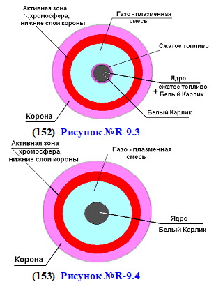 С возрастом размеры белого карлика увеличиваются (рисунок №R-9.3), ближе к концу жизни белый карлик занимает весь объем ядра звезды, а сжатое топливо переходит в состав газо-плазменной смеси (рисунок №R-9.4).